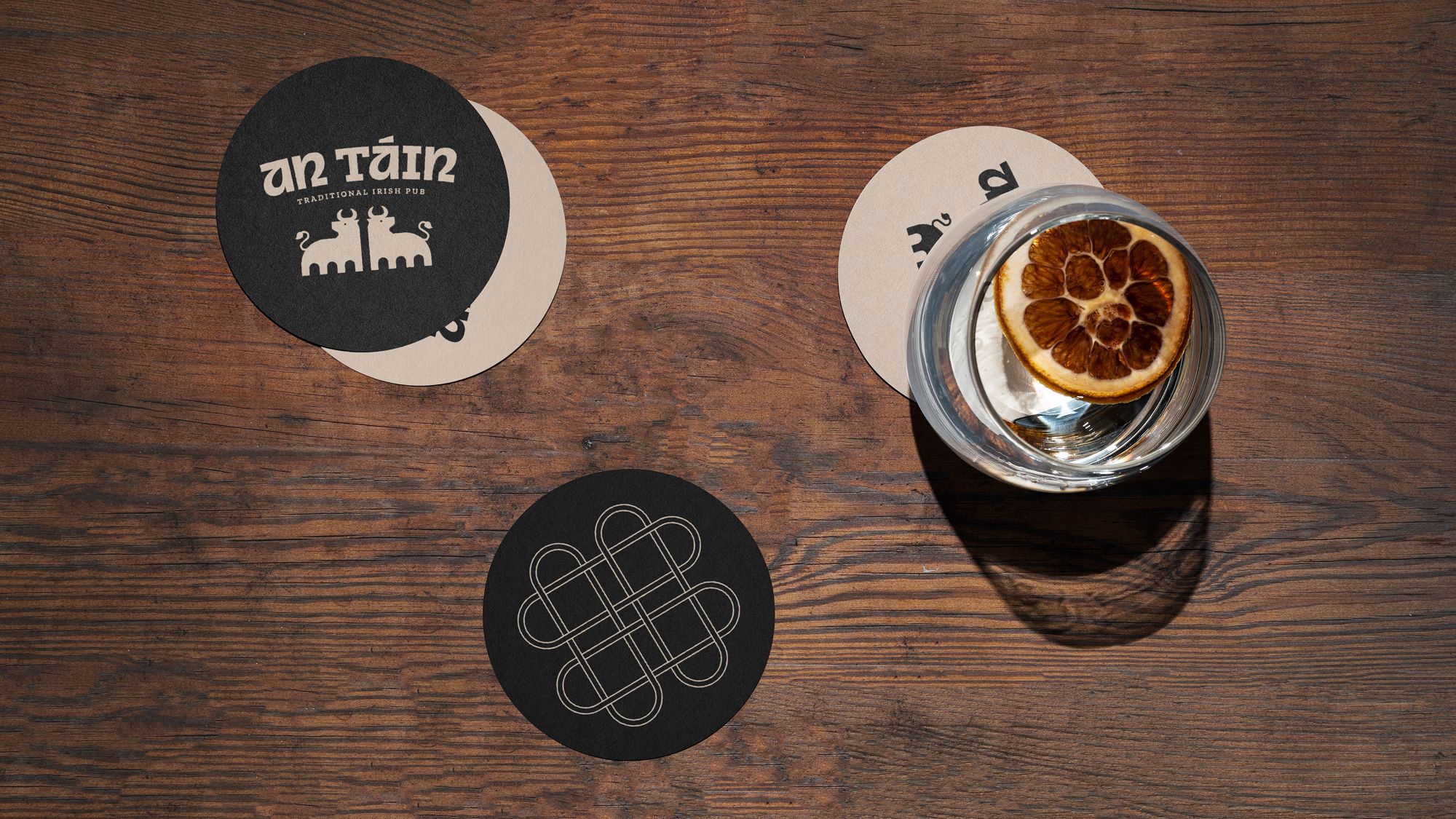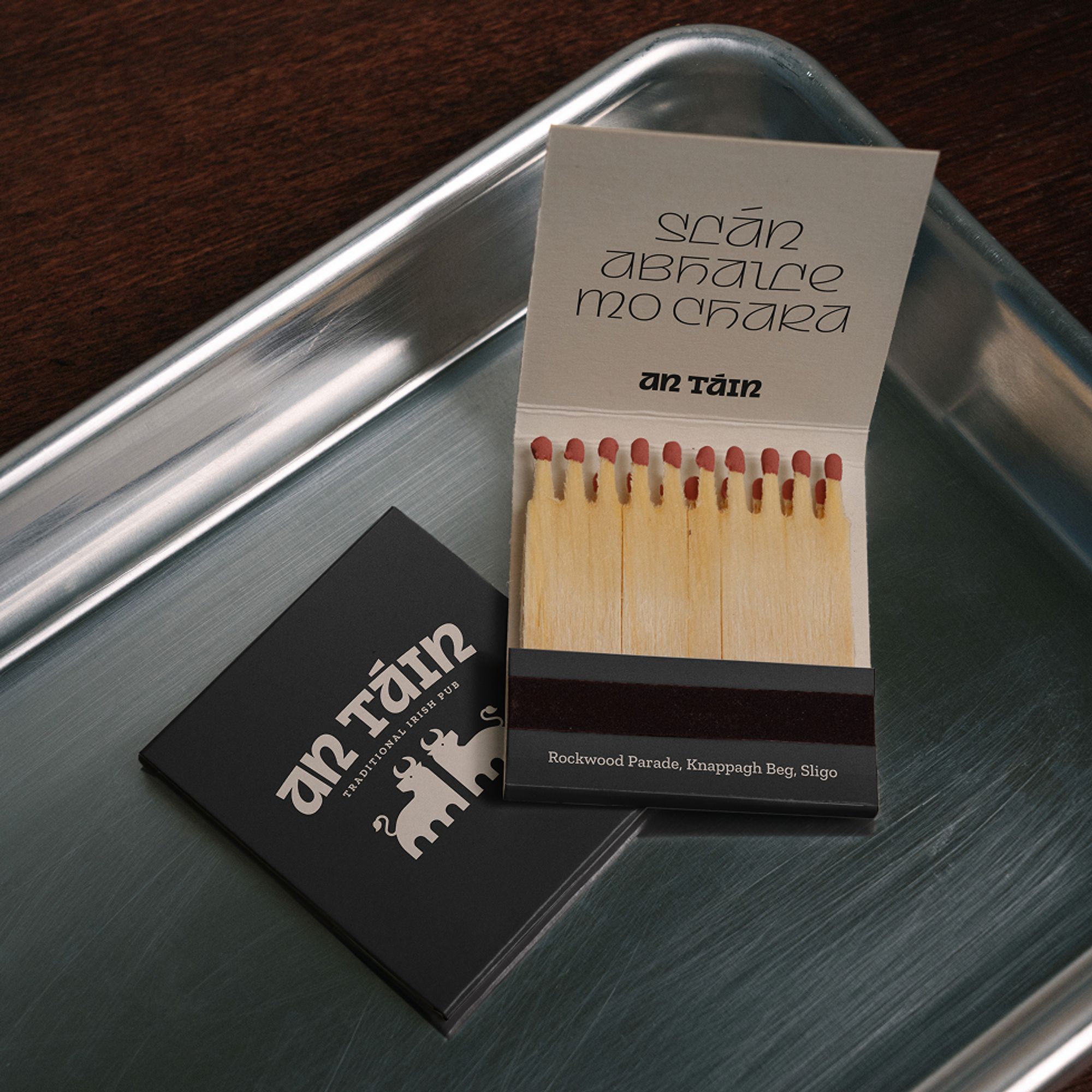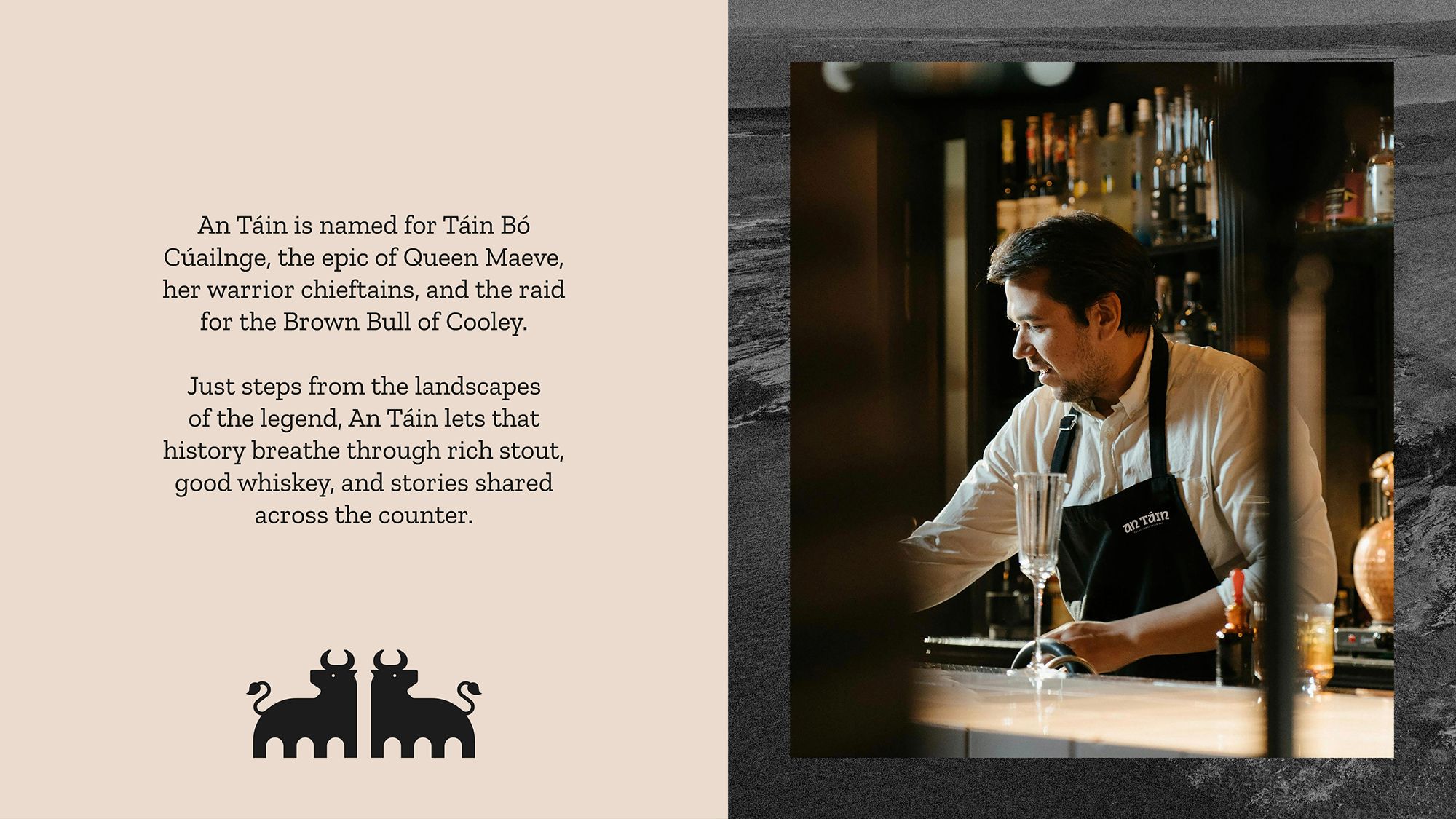 An Táin is a warm, mythology-inspired bar in the heart of Sligo’s Queen Maeve Square. Rooted in Irish storytelling and the legendary Táin Bó Cúailnge, it was envisioned as a venue where people gather for a pint, a whiskey, and great conversation. The brand identity needed to honour this cultural heritage while presenting a distinctive, social late-night destination.